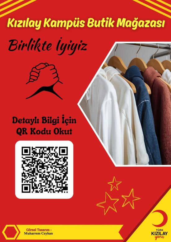 Vali Şinasi Kuş Kongre Merkezi içerisinde hizmet veren Kızılay Butik Mağazası, öğrencilerimize yönelik giyim desteği sunmaktadır. Dayanışma ve paylaşma kültürünü kampüs hayatının bir parçası hâline getirmeyi amaçlayan bu projede, öğrenciler hem destek alabiliyor hem de gönüllü olarak katkı sağlayabiliyor. Butik mağaza hakkında detaylı bilgiye ulaşmak için afişte yer alan QR kodunu okutarak bilgi alabilirsiniz.